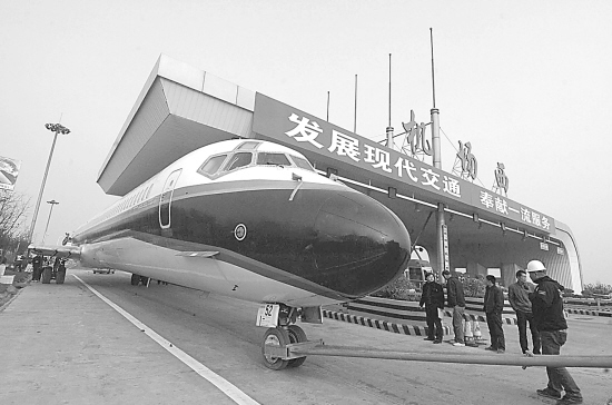 西安引进用于职业教育的教学实践飞机 11月29日,麦道82客机机身在大型运输车的推动下驶出西安咸阳国际机场高速公路收费站。当日,西安航空旅游学院从南方航空公司引进的麦道82大型客机,从西安咸阳国际机场出发,用货车运至校区。这是西北地区拥有的首架用于航空职业教育的教学实践飞机。新华社发
