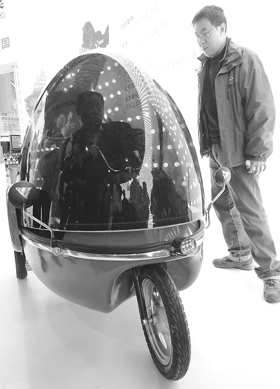 第四届北京国际文化创意产业博览会闭幕 11月29日,观众在文博会中国创新设计红星奖展厅观看展出的“小水滴电动车”。当日,为期5天的第四届中国北京国际文化创意产业博览会闭幕。新华社发