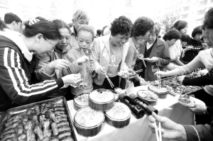 11月28日,柳州市宏都社区居民在“和谐邻里乐”活动上品尝百家宴美食。