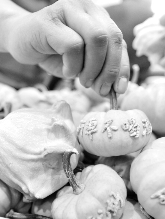 左图:11月27日,2009浙江农博会在杭州开幕,全国各省市的1200多家各类型农业企业参展,集中展示展销一批精品农产品。图为商家正在农博会上推销一种表面有字的特色南瓜。 新华社记者 王定昶 摄