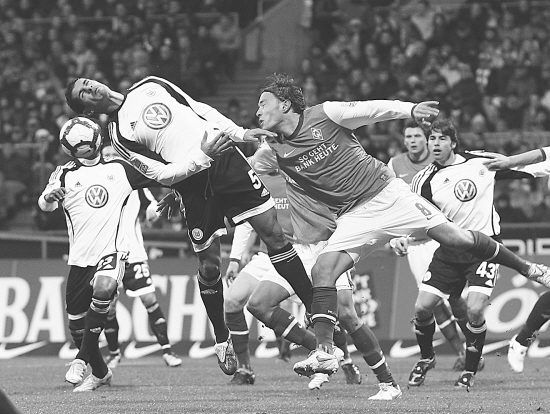 11月28日,不来梅队球员弗里茨(前右)与沃尔夫斯堡队球员科斯塔拼抢。当日,在德甲联赛第14轮比赛中,不来梅队主场以2比2战平沃尔夫斯堡队。 新华社/路透