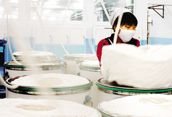作为全国优质棉生产基地县,扶沟具有得天独厚的棉花深加工条件。在发展棉纺织业过程中,该县依托中方实业、陆新棉纺等一大批龙头企业,大力推广“企业+农户”的订单农业发展,不断壮大棉纺规模,继而带动了服装业的迅速发展,延伸了产业链条。图为一名工人正在车间紧张工作。(记者 沈湛 摄)