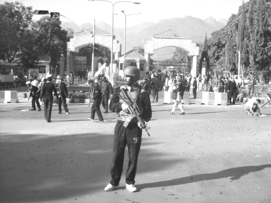 巴基斯坦海军总部前发生自杀式炸弹袭击 12月2日,在巴基斯坦首都伊斯兰堡巴海军总部大门前,一名安全人员在自杀式炸弹袭击现场附近警戒。当地警方介绍,一名自杀式袭击者当日试图闯入巴海军总部,在总部大门前被安全人员拦截后,袭击者引爆了自身携带的炸弹。一名安全人员被炸死,3人受伤。新华社发