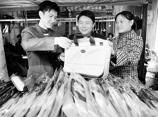 返乡创业天地宽 余彦彬(左)在介绍企业生产的电脑包(12月1日摄)。一年多前,江西省新建县松湖镇港北村的返乡农民工余彦彬,在当地政府的帮扶下,创建了一家箱包生产企业。如今他的企业里有26名员工,每月生产箱包6000多个,产品远销北京、上海等地。 新华社记者 周科 摄
