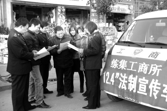 时值第九个全国法制宣传日,练集工商所组织执法人员走上街头进行“12·4”法制宣传活动。图为该所执法人员向群众提供普法宣传、法律咨询、法制教育等法律服务。(卢西 李修宣 摄)