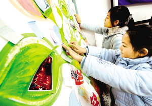 12月9日,学生们在展板上粘贴爱国留言。当日,南京林业大学的部分共青团员来到南京市长江路小学,和小学生一同开展纪念“一二·九”运动74周年活动。(新华社记者 孙参 摄)