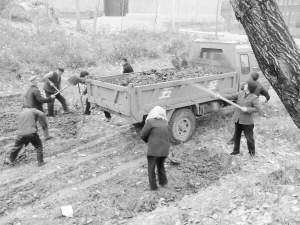 商水县位集镇苏童村老党员苏新国组织群众在坑塘取土,把土填到村内街巷的低洼处,受到了村民的赞扬。图为他们取土装车的情形。(苏建广 摄)