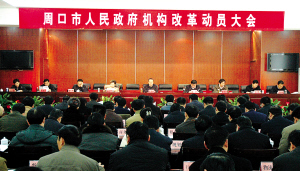 市领导徐光、吕彩霞、李洪民、穆仁先、王申亭、武建新、刘继标、王宇燕出席会议。市长徐光作动员报告。市委常委、常务副市长王申亭宣读了中共周口市委、周口市人民政府关于印发《周口市人民政府机构改革实施意见》的通知。市委副书记吕彩霞主持会议。