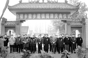 12月12日上午,淮阳县白楼乡政府门前鼓乐齐鸣,该乡撤乡设镇揭牌仪式在这里隆重举行。根据省、市有关部门批复,即日起白楼乡撤乡设镇。多年来,白楼历届党委、政府持之以恒,一张蓝图绘到底,为撤乡设镇奠定了良好的基础。近年来,全乡干群聚精会神搞建设、一心一意谋发展,全面推进社会主义新农村建设,经济发展和社会各项事业都取得了长足进步。撤乡设镇后,对于推动城乡统筹、促进地方经济发展有着重要意义。(杜欣 摄)
