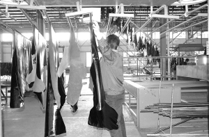 市委、市政府鼓励企业依托技术进步调整产品结构,不断提高产品的科技含量,进而提高产品附加值,发展壮大企业,加快产品结构调整,提升产品竞争力。图为项城市某皮革厂工人在生产车间工作。
