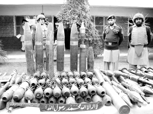 12月12日,在巴基斯坦西北部开伯尔部落地区,巴安全人员向媒体展示缴获的武器弹药。巴基斯坦军方当天在开伯尔及附近部落地区打死20多名武装分子,并抓获多名塔利班武装分子,缴获大量武器弹药。 新华社发