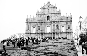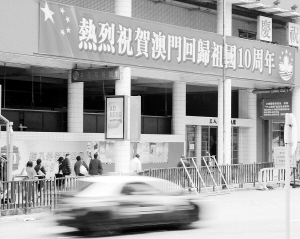 连日来,澳门街头装扮一新,充满了庆祝澳门回归祖国10周年的喜庆气氛。图①:澳门街头一景。图②:游人在澳门大三巴牌坊观光。
