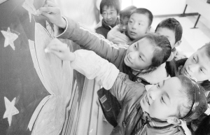 图③:12月20日,两个农民工孩子用粉笔在黑板上描绘澳门特别行政区区旗。当日,安徽大学春晖学社的大学生志愿者邀请30余名农民工孩子来到校园,以知识竞赛和绘画的形式向孩子们讲解澳门的历史和现状。农民工孩子还用彩笔绘出了自己心目中的澳门,祝福澳门的明天更美好。