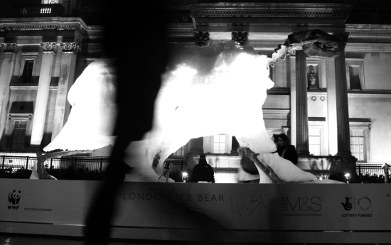 12月19日,在英国伦敦的特拉法加广场,一名男子走过部分融化已露出铜制骨架的冰熊雕塑。冰雕作者希望通过雕塑的融化唤起人们对气候变化的警觉。随着哥本哈根气候峰会落幕,这座冰雕于20日结束在特拉法加广场的展出。新华社发