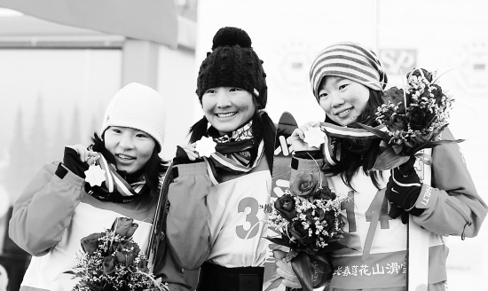 12月20日,中国选手徐梦桃(中)和队友郭心心(左)、张鑫在颁奖仪式上。当日,在长春进行的2009/2010赛季自由式滑雪国际雪联世界杯第二站空中技巧比赛中,徐梦桃以207.68分夺得冠军,队友郭心心、张鑫分获二、三名。 新华社记者王昊飞摄