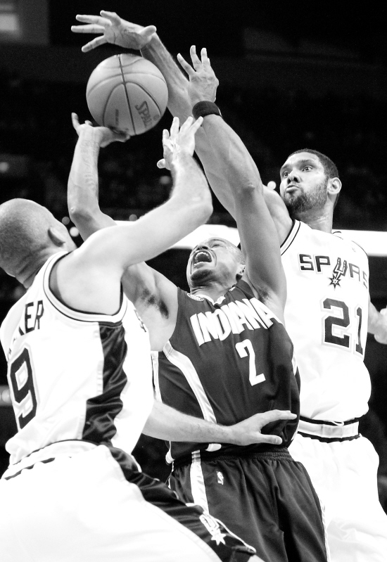 12月19日,圣安东尼奥马刺队球员邓肯(右)和队友帕克(左)共同封堵印第安纳步行者队球员沃森的进攻。当日,在NBA常规赛中,圣安东尼奥马刺队主场以100比99战胜印第安纳步行者队。 新华社/路透