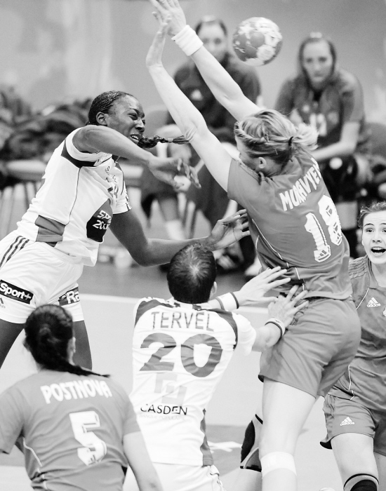 12月20日,法国队球员玛丽亚马(左上)比赛中进攻。当日,在第十九届世界女子手球锦标赛决赛中,法国队对阵俄罗斯队。 新华社记者 杨磊 摄