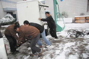 尽管抢险并不属于代维人员的工作范畴,但他们仍然坚持带病工作,这种不怕吃苦的精神,深深地打动着在场每一位“移动人”的心。此次抢险中,铁通共出动人员60多人,累计发电800多个小时,全力配合了周口移动的抗灾抢险工作。信阳移动委派“北京创和”代维公司的四名技术能手参与到这场抗雪灾保通信工作当中,他们不仅熟练掌握开车、发电等各项技术,而且有着极强的敬业精神,面对繁重的发电工作,他们从没有喊过苦、叫过累,随时听从调遣。
