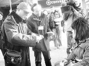 李高峰(左一)在北京街头参加志愿者活动。