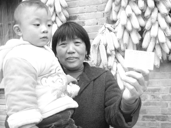 太康县委、县政府立足平安创建和构建和谐社会,积极筹措资金,在全县700多个行政村设立了平安大喇叭,建立了治安巡逻队。夜里,只要村民拨打平安大喇叭电话号码,大喇叭立即发出警笛声,治安巡逻队员就会马上前往查看。图为太康县高贤乡刘寺岗村一农妇在展示政府发放的平安卡。 (记者 孙安平 摄)