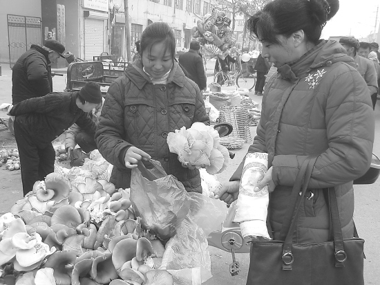5年前,商水县舒庄乡三所楼村村民王倩在计生协的帮助下,建起了大棚发展蘑菇生产。几年来,她靠蘑菇生产年收入3万多元,连年被县、乡计生部门评为“少生快富标兵”。图为王倩在集市上以每公斤6元的价格销售蘑菇。(乔连军 靳连森 摄)