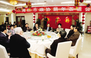本报讯(记者 李凤霞)12月30日晚,周口饭店宴会厅鲜花吐艳,春意盎然,笑语盈盈,市政协2010年新年茶话会在这里举行。市领导毛超峰、徐光、吕彩霞、李洪民、穆仁先、朱家臣、李明方、梅宝菊、范明、武建新、张耀荣、刘继标、杨正超与各界人士欢聚一堂,畅叙友情,共话发展,喜迎新年。