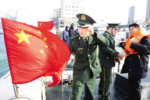| 1月4日,青岛八大峡边防派出所警官在小港轮渡码头进行安全检查,提醒留守船员做好海上防风防寒准备。当日, 受寒潮大风天气影响,青岛海上最大风力达到8级,最低气温为零下11摄氏度,相关部门同时启动风暴潮Ⅲ级应急预案。(李紫恒 摄) |