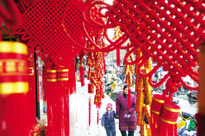 | 1月4日,两名路人从一商铺悬挂的节日饰品前经过。随着春节临近,合肥市场上中国结、红灯笼、对联、生肖虎贴等节日饰品热销。(李健 摄) |