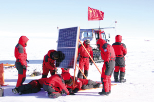 | 1月2日以来,肆虐的暴风使中国南极内陆格罗夫山考察队被困营地。利用暴风趋缓的间隙,考察队1月4日在营地附近成功安装一台地震观测台站。这是中国首次在南极内陆格罗夫山地区部署地震观测台站。(崔静 摄) |