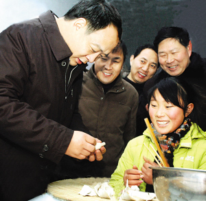 上午10时许,毛超峰来到由张兰夫妇和4个孩子组成的家庭。客厅里,“妈妈”张兰正和几个孩子在包饺子。毛超峰环顾干净整洁的房间,饶有兴趣地询问这个家庭的详细情况:每个孩子的年龄、来自哪个村庄、家里还有什么亲人、学习成绩等等。当得知这“张妈妈”为了更好地照顾这些孤儿,特地把家安在了这里时,毛超峰称赞“这种家庭是一种好形式”。他同时嘱咐张兰夫妇要照顾好孩子们,把他们抚养成人、培育成才。看到16岁的韦方方包的饺子像元宝,毛超峰还专门向她学习包饺子的方法。 随后,毛超峰仔细察看了孩子们的宿舍,看到这里干净明亮、被褥整洁,毛超峰脸上露出满意的笑容。