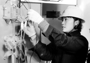 舒艳是郸城县电业局诚信有限公司安装队里唯一一位的女性。她和男队员一样,顶风雪,冒酷暑,总是不知疲倦的工作着,默默地奉献着自己的青春。(刘兴刚 刘春荣摄)