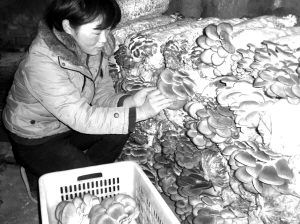 昨日,商水县舒庄乡黄庄村育龄妇女王爱红正在蘑菇大棚里采蘑菇。近两年来,该乡计生协通过人口学校、阳光培训基地对育龄妇女进行食用菌技术培训,并协调帮扶资金100多万元,使全乡1200多名育龄妇女靠发展食用菌走上致富路。(乔连军 摄)