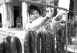昨日,市民朱女士在挂晾熏制好的腊肠。进入腊月,我市各大农贸市场和超市,腊肉销量在不断增加,不少市民也在阳台和院内挂晾自己加工制作的腊肉、腊肠,为即将到来的春节作准备。