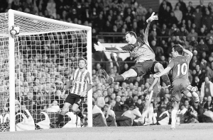 1月16日,切尔西队球员乔·科尔(右)在比赛中头球攻门,打中球门立柱。当日,在英超第22轮比赛中,切尔西队主场以7比2战胜桑德兰队。 新华社/路透