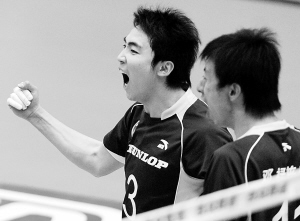 1月17日,上海队球员黄彬(左)在比赛中庆祝得分。当日,在2009-2010赛季全国男排联赛第九轮比赛中,上海队客场以3比0战胜北京队。 新华社记者 孔卉 摄