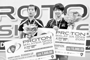 1月24日,冠军汪鑫(右)和亚军裴延珠在颁奖仪式上。当日,在马来西亚羽毛球超級系列赛女子单打决赛中,韩国选手裴延珠因伤中途退出,中国选手汪鑫夺得冠军。
