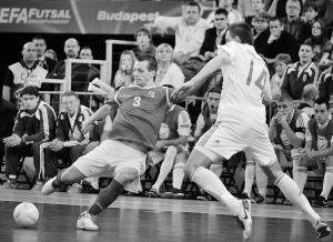 1月23日,捷克队球员波拉谢克(左)在比赛中射门。当日,在室内5人制足球欧洲锦标赛A组比赛中,捷克队以6比5战胜匈牙利队。