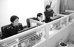 市“12315”指挥中心经过设备更新、系统软件升级,以现代化的手段建立起快速、便捷的“绿色通道”,拓宽了职能范围,进一步方便了消费者和经营者进行投诉。目前,指挥中心运转顺畅,办理、反馈畅通。图为工作人员在通过电话受理消费者投诉。 ( 记者 王映 摄)