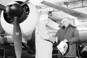 二战死敌65年后罗马尼亚“握手言和” 1月23日,在罗马尼亚首都布加勒斯特的航空博物馆,曾在第二次世界大战一场空战中遭遇过的罗马尼亚老飞行员多布朗(右)与美国老飞行员戴维斯握手致意。当天,两位曾经在空中战场上交过手的死敌65年后在布加勒斯特重逢,尽释前嫌。1944年6月6日,罗马尼亚飞行员多布朗在该国东部城市加拉茨的上空驾机阻截对罗南部城市执行轰炸任务的美国空军,美国飞行员戴维斯在战机被击中后跳伞逃生。新华社发