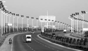 1月25日,汽车行驶在安装了太阳能路灯的锦州市渤海大道上。 日前,安装在辽宁省锦州市渤海大道两旁的太阳能路灯正式投入使用。据悉,这些由1512块太阳能电池组件组装的太阳能路灯,每天可节电637度。 新华社发(李铁成 摄)