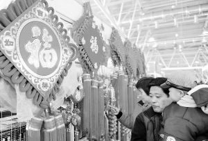 1月28日,几位市民在挑选“中国结”。当日,第7届济南年货交易会在山东省济南市舜耕会展中心开幕,来自全国各地的近千种年货商品丰富了济南节前市场,吸引大批市民前来选购。新华社记者 朱峥 摄