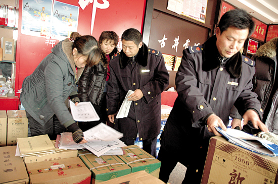 昨日,市工商局车站工商所工作人员对节日酒类经销单位进行拉网式检查,,确保消费者喝上放心酒。(记者 王映摄)