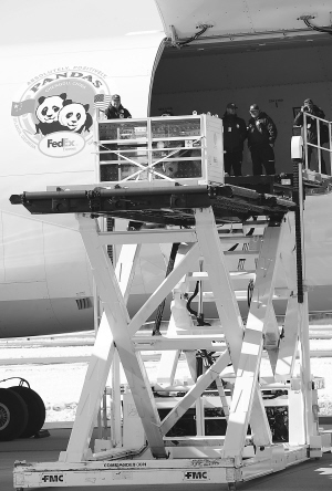 16时40分,飞机停稳后,中方检疫人员立即对机身和陆地进行喷雾消毒。随后,工作人员将熊猫笼从飞机上运下,并放在专用运货车上。经过14个多小时的长途跋涉,“泰山”和“美兰”似乎并没有疲惫。两个小明星透过玻璃窗,不停地看着外面,对家乡人充满了好奇。
