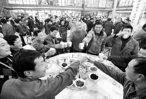 2月7日,上海建工集团千余名参加世博会园区建设的外来务工人员欢聚一堂,共进晚餐。据悉,春节期间有千余名外来务工人员放弃休假,在世博园工地上挥洒汗水。