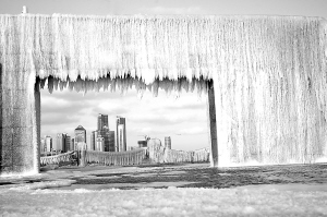 2月12日,烟台市东炮台旅游码头挂满海水冰凌。持续3天的大风和低温天气使山东省烟台市海滨出现冰凌美景,绵延数公里,蔚为壮观。 新华社发