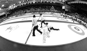 2月20日,中国队选手王冰玉(右)在比赛中掷壶。当日,中国队在温哥华冬奥会女子冰壶比赛中以9比5战胜德国队。 新华社记者 陈晓伟 摄