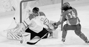 2月20日,中国女子冰球队队员孙锐(右)在比赛中逼近对方球门。当日,中国队在温哥华冬奥会女子冰球比赛中以0比6负于瑞士队。