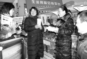鹿邑县下岗女工李琳辉(右二)在自己新开办的生活用品社区店里向顾客介绍商品。她通过参加劳动部门的再就业培训,确定了开办经营店铺的创业项目,工商部门又启用创业、就业“绿色通道”为她免费办理营业执照,带动10多人走上了就业岗位。 (刘春华 蒋保庆 摄)