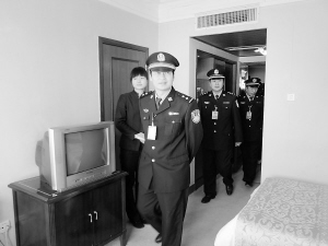 昨日,负责“两会”安全的民警在代表和委员驻地进行安全检查。为确保“两会”顺利召开,市公安局在与会代表和委员住处加派人员,进行安全检查和不定时巡逻。(记者 孙安平 摄)