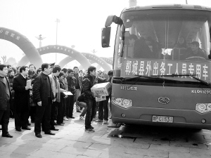 左图为洺北办事处外出务工人员赶乘专用车。(记者 卢好亮 摄)